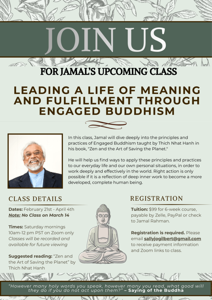 Date: Saturday, March 7. 2026 , 10:00am - 12:00pm Location : Zoom6 week Spiritual Developement Class on Zoom with Imam Jamal Rahman. "Leading a LIfe of Meaning and Fulfillment through Engaged Buddhism" Dates/Times: 6 Saturday mornings, February 21, 2026-April 4, 2026 ; 10:00am-noon Pacific Time (No Class on Saturday, March 14) About This Class In this class Jamal will dive deeply into the principles and practices…