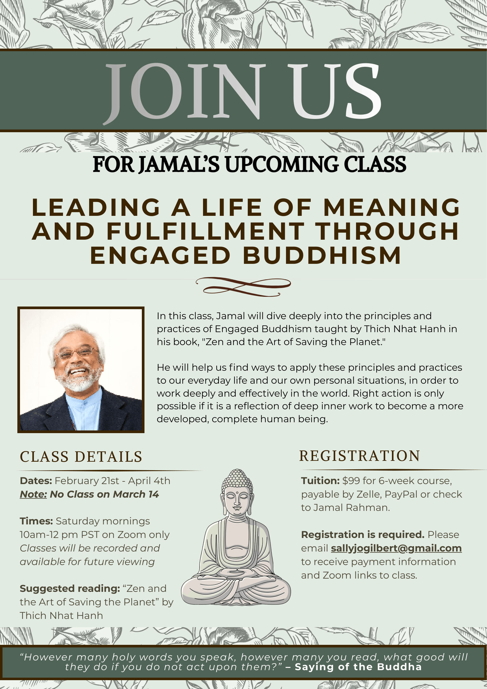 In this class Jamal will dive deeply into the principles and practices of Engaged Buddhism taught by Thich Nhat Hanh in his book, "Zen and the Art of Saving the Planet." He will help us find ways to apply these principles and practices to our everyday life and our own personal situations, in order to work deeply and effectively in the world. Right action is only possible if it is a reflection of deep inner work to become a more developed, complete human being.