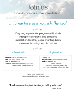 We are delighted to announce that Imam Jamal Rahman will be offering a one-day, in-person Summer Workshop to Nourish and Nurture the Soul on Saturday, August 23, 2025, 10 am- 4 pm at Interfaith Community Sanctuary in Ballard.