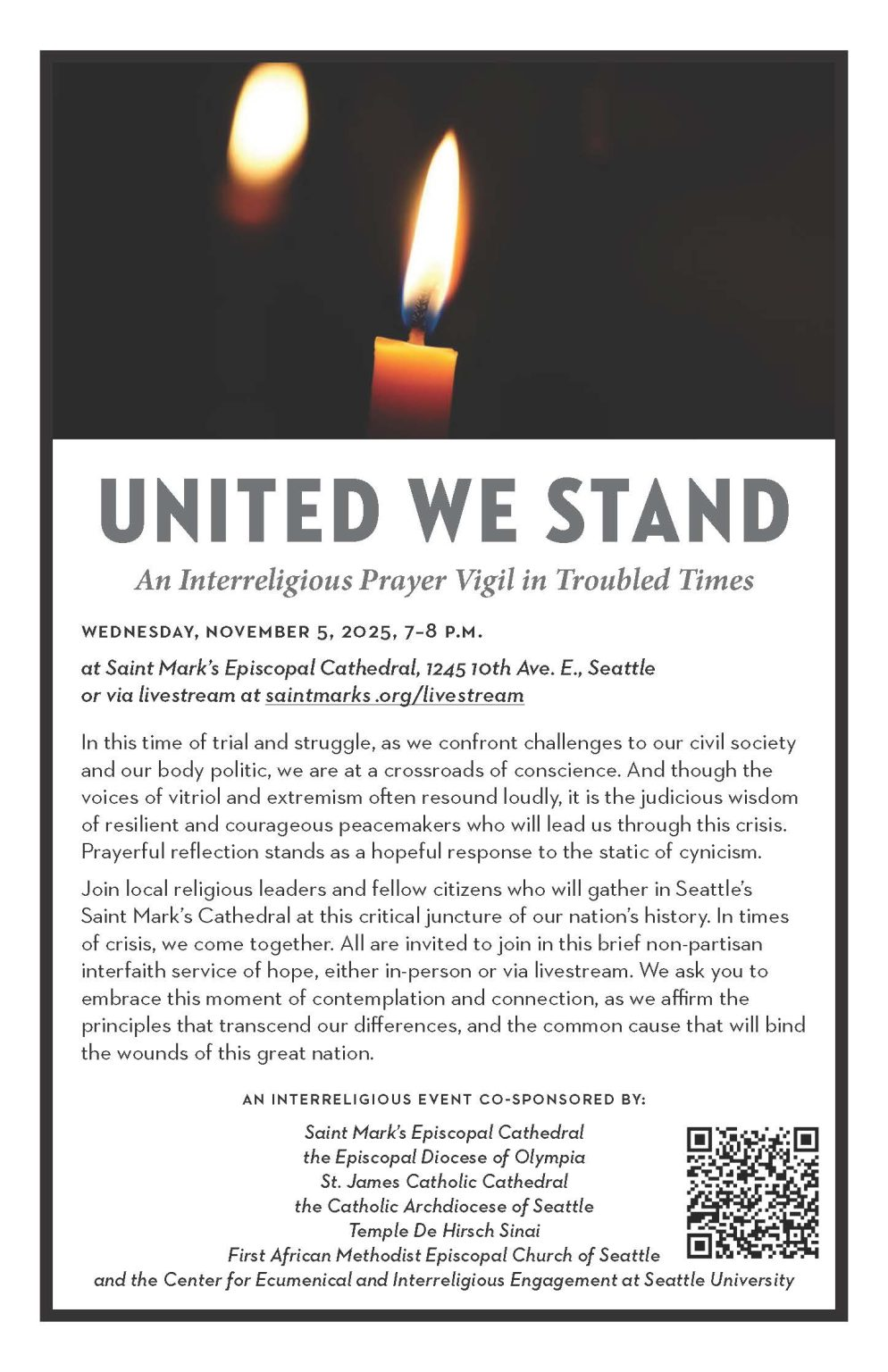 Join local religious leaders and fellow citizens who will gather in Seattle’s Saint Mark’s Cathedral at this critical juncture of our nation’s history. In times of crisis, we come together. All are invited to join in this brief non-partisan interfaith service of hope, either in-person or via livestream. We ask you to embrace this moment of contemplation and connection, as we affirm the principles that transcend our differences, and the common cause that will bind the wounds of this great nation.